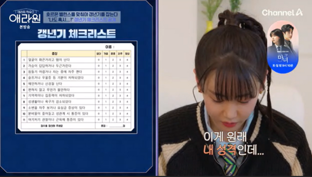 자가 체크리스트도 진행했다. 별은 “원래 내 성격이 이런데. 수치로만 보면 이미 갱년기”라며 멤버들 중 가장 높은 26점을 받았다. 밤에 자주 깨거나 예민한 것도 최근이 아니라면서 별은 “저는 갱년기가 없으려나 보다. 놀라울 정도로 20대 때부터 있던 증상이 많다”라고 말했다.