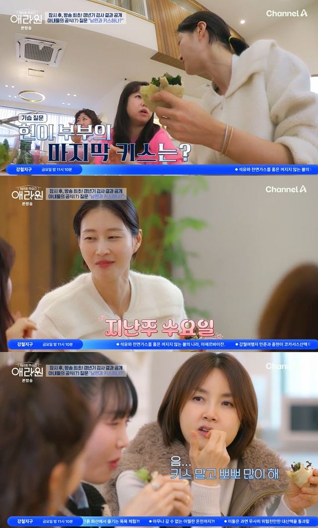 이에 홍현희는 이현이에게 "마지막 키스가 언제냐"고 물었고, 이현이는 "지난주 수요일"이라고 말했다. 박은영은 "아직도 키스하냐"고 놀라면서 신애라에게 "언니도 키스하시냐"고 물었다.