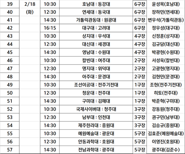 오는 21일 광주대와 칼빈대, 명지대와 세경대, 상지대와 대구대, 김해대와 연세대가 대회 20강전을 펼친다. 여기서 승리해야 16강에 진출할 수 있다.