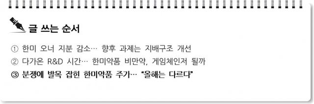 한미약품 주가 하락 배경에는 오너 일가의 경영권 분쟁이 자리한다. 분쟁으로 인한 R&D(연구·개발) 경쟁력 약화 우려와 투자자들의 신뢰 하락 등의 영향으로 한미약품 주가가 지난 1년 동안 하락세를 기록한 것으로 증권가는 분석한다. 한승연 NH투자증권 연구원은 "한미약품은 최근 1년 이상 지속된 경영권 분쟁에 따라 본질 가치(영업가치+신약가치) 대비 30~40% 디스카운트가 돼 왔다"고 설명했다.