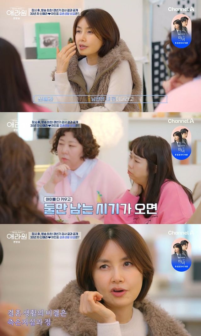 이날 신애라는 "남편은 남의 편처럼 생각하면 안되겠더라. 남편은 내 편이더라. 오로지 유일한 내편"이라면서 "아이들이 어릴 땐 오히려 아이들에게 집중하니까 서로에게 소홀할 수 있지만, 아이들이 크고 각자의 삶으로 가면 미우나 고우나 배우자가 있다는 게" 좋다면서 "측은지심과 미운 정, 고운 정"이 중요하다고 말했다.