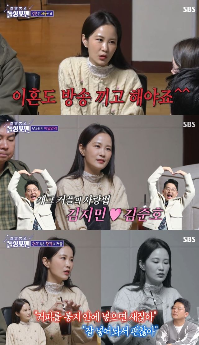 "방송 끼고 했다가 이혼하면 어떻게 하냐"는 탁재훈의 돌직구 질문에 김지민은 "이혼도 방송 끼고 해야죠"라고 받아쳐 현장을 폭소케 했다.