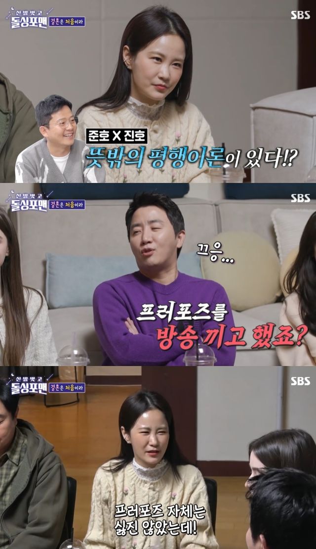 이날 이상민은 "김준호 씨와 홍진호 씨 공통점이, 둘 다 프러포즈를 방송 끼고 했다"고 운을 띄웠다. 이에 홍진호는 "인생에서 후회하는 몇 안 되는 일 중 하나"라며 고개를 저었다.