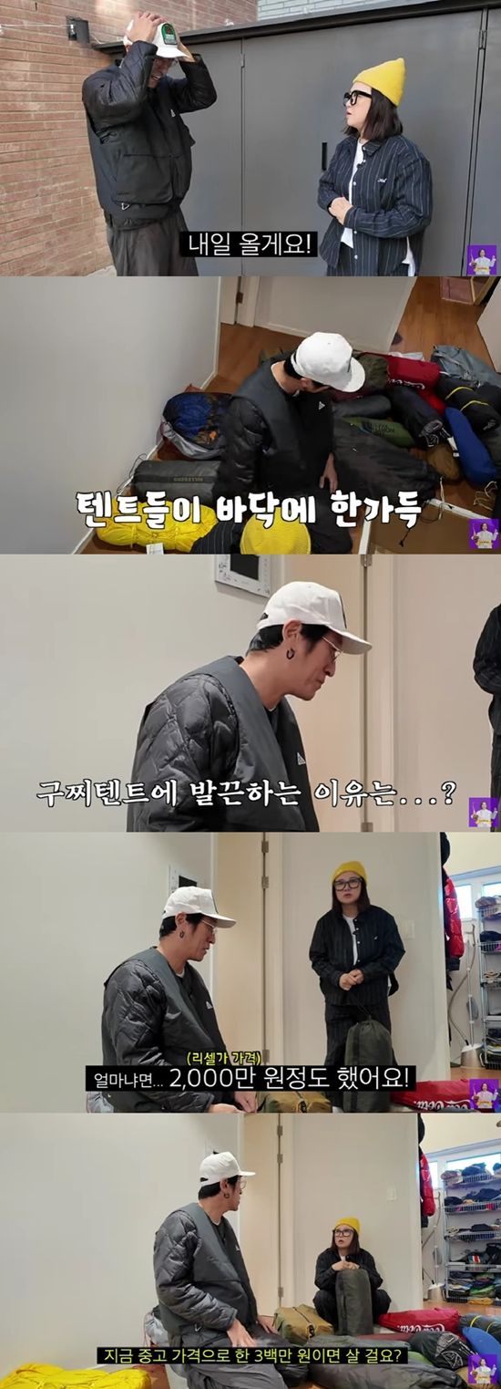 빽가가 수십 여개의 텐트를 꺼내자, 김숙은 "완전 비싼 것들 나오고 있다"며 환호성을 내질렀다.