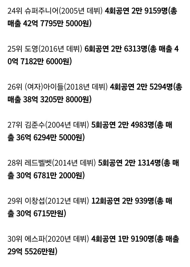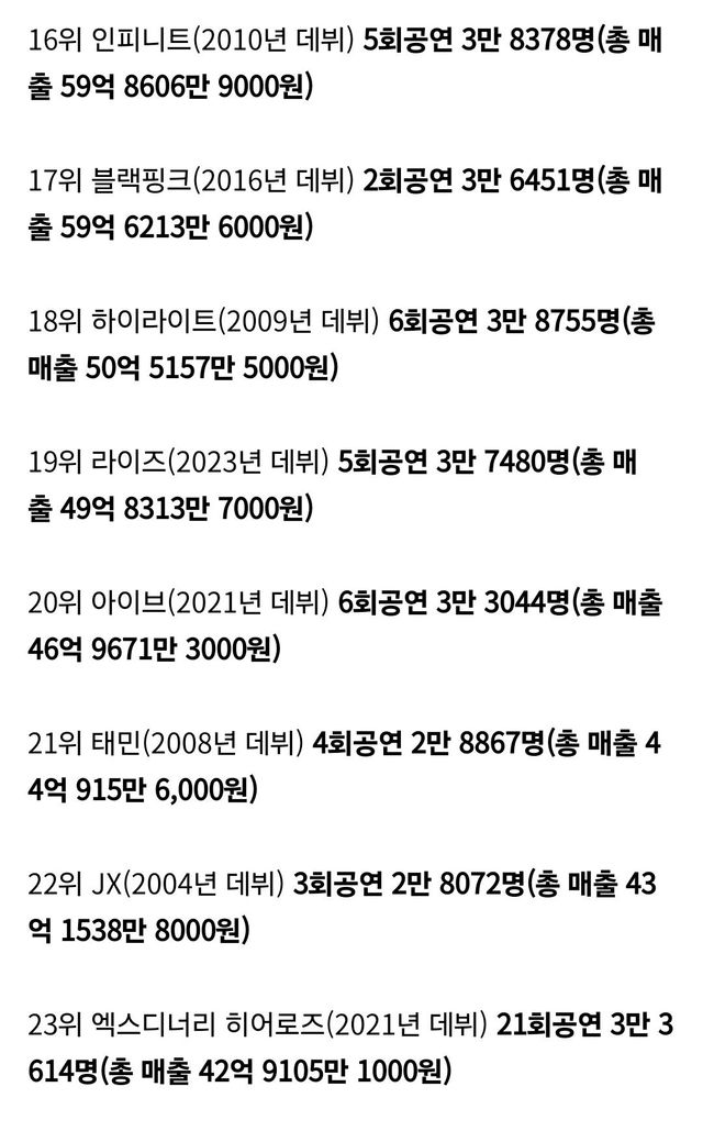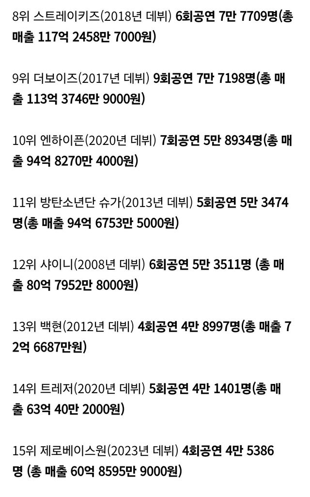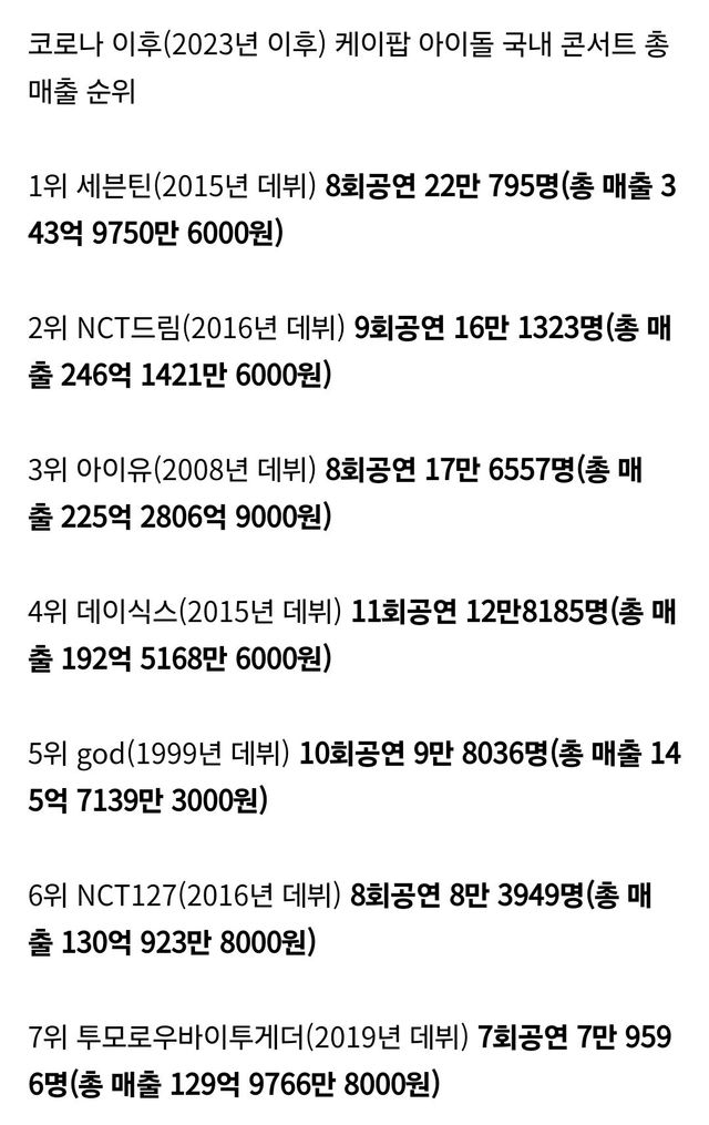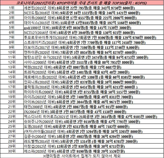 코로나 이후(2023년 이후) 케이팝 아이돌 국내 콘서트 총 매출 순위