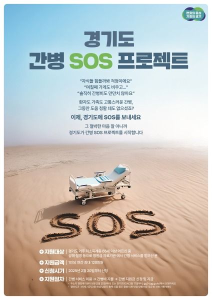 간병 SOS 프로젝트는 경기도 내에 거주하는 기초생활수급·차상위계층 가운데 올해 들어 상해·질병으로 병원급 의료기관 이상에 입원해 간병서비스를 받은 65세 이상 노인에게 횟수와 관계없이 연간 최대 120만원의 간병비를 지원하는 사업이다.
