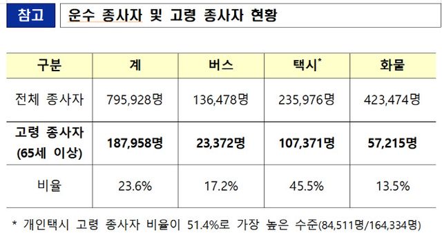 만 65세 이상 사람이 운수 종사자가 되기 위해선 매3년(만 65~69세) 또는 매년(만 70세 이상)마다 한국교통안전공단이 실시하는 ‘자격유지검사’를 받아야 한다. 이러한 자격유지검사를 받는 택시·버스·화물차 운수종사자는 18만 7958명으로 전체(79만 5928명)의 23.6%에 해당한다. 특히 택시의 경우 10만 7371명으로 전체(23만 5976명)의 45.5%에 달할 정도로 많다.