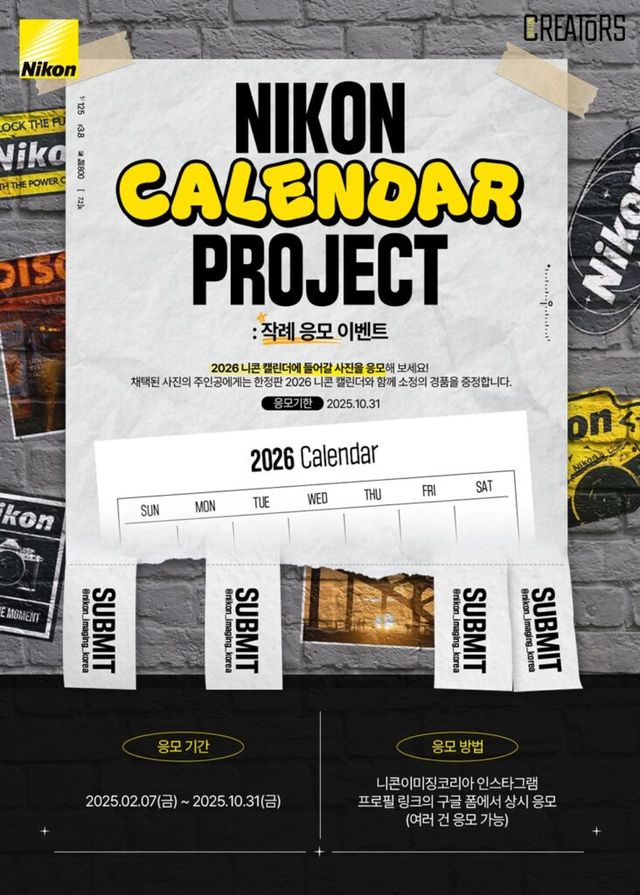 니콘 카메라를 통해 세상을 기록해 온 수많은 사진 애호가에게 특별한 기회가 찾아왔습니다. 광학기기 전문기업 니콘이미징코리아가 고객 참여형 ‘니콘 캘린더 프로젝트: 작례 응모 이벤트’를 오는 10월 31일까지 진행하는데요. 니콘 카메라 사용자라면 누구나 참여할 수 있으며, 심사를 통해 당첨자가 선정됩니다.