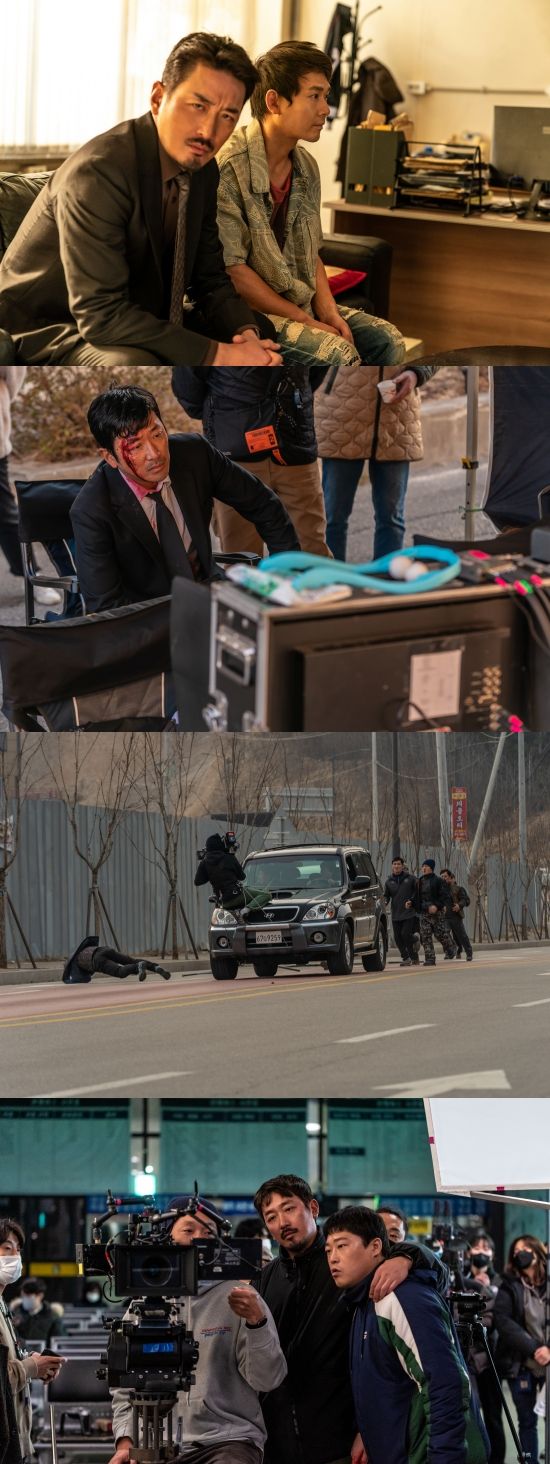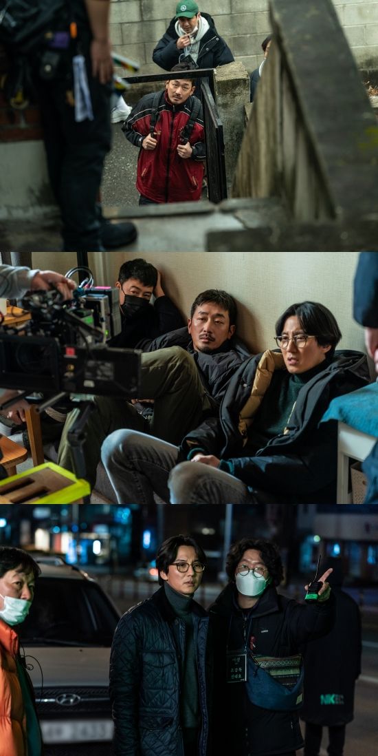 공개된 비하인드 스틸은 밀도 있는 추적극을 만들기 위해 치열하게 고민하고 노력했던 촬영 현장의 열기를 그대로 전달한다. 하정우와 김남길은 ‘민태’와 ‘호령’이 처음 충돌하는 장면을 모니터링하고 있다. 이들의 진지한 모습은 작품의 긴장감을 최고조로 끌어올린 두 사람의 완벽한 대립 케미스트리가 어떻게 나올 수 있었는지 가늠케 한다.