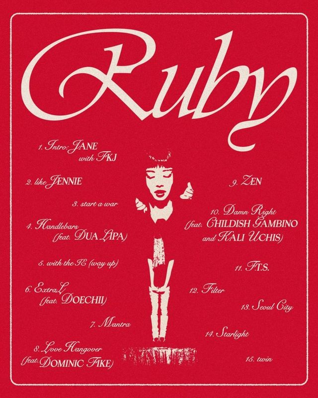 ‘Ruby’는 제니의 무한한 음악적 가능성이 담긴 만큼 제니만의 색이 담긴 음악으로 꽉 채웠다. 특히, 차일디쉬 감비노(Childish Gambino), 도이치(Doechii), 도미닉 파이크(Dominic Fike), 두아 리파(Dua Lipa), FKJ, 칼리 우치스(Kali Uchis) 등 세계적인 아티스트들이 피처링으로 참여해 글로벌 음악 팬들의 기대를 한 몸에 받고 있다.