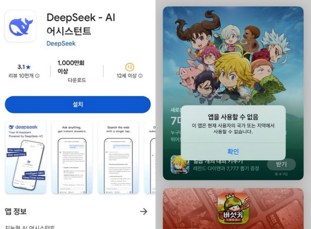 안드로이드폰과 달리 과거 설치 이력이 있는 아이폰 사용자가 딥시크 웹사이트에서 같은 버튼을 누르면 애플앱스토어로 이동되지만 앱 설치가 안되고 ‘이 앱은 사용자의 국가 또는 지역에서 사용할 수 없다“는 안내가 뜬다. 구글 플레이스토어에서도 이같이 차단돼야 하는 게 상식적이지만, 과거 한번 설치한 사용자는 자유롭게 삭제 후 재설치가 가능한 상황이다.