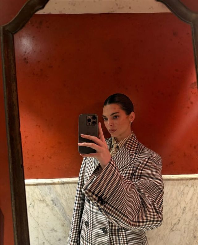 켄달 제너는 클래식한 플레이드 체크 패턴의 오버사이즈 코트를 활용해 대디 코어 룩을 완성했습니다. 박시한 실루엣의 더블브레스트 코트는 마치 빈티지 숍에서 발견한 듯한 레트로 무드를 풍기는데요. 여기에 스트라이프 패턴의 셔츠와 타이를 더해 클래식한 느낌을 배가했습니다. 패턴과 패턴을 과감하게 믹스했음에도 불구하고 컬러 톤을 맞추어 과하지 않게 연출한 점이 돋보입니다. 대디 코어의 핵심인 ‘여유로운 핏’과 ‘클래식한 디테일’을 완벽하게 소화한 스타일링이죠.