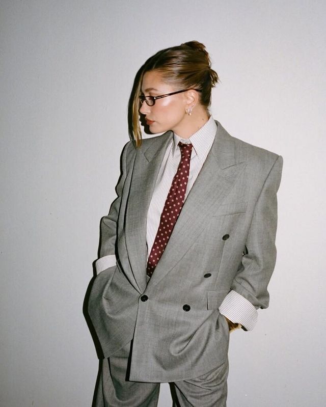 ‘파워 테일러링’의 정석을 보여준 헤일리 비버. 전형적인 남성 정장 구조에 힘 있는 실루엣을 자랑하는 회색 더블브레스트 블레이저를 선택했습니다. 특히 그의 룩에서 주목할 부분은 컬러 팔레트인데요. 90년대 직장인 룩을 연상시키는 모노톤 계열의 수트에 클래식한 분위기를 살려주는 버건디 넥타이를 매치해 빈티지하면서도 현대적인 감각을 동시에 담아냈죠. 여기에 브라운 안경과 슬릭백 헤어를 더해 클래식한 분위기를 한층 강조했습니다.
