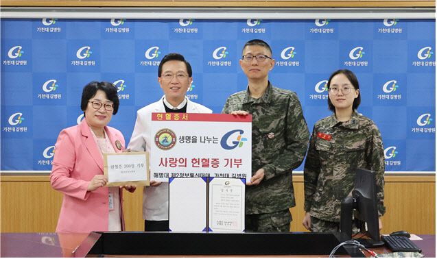 가천대 길병원은 꾸준히 생명 나눔을 실천하고 있는 해병대2사단 정보통신대대에 감사장을 전달했다. 김우경 길병원장은 “질병과 경제적 어려움 등으로 고통 받고 있는 환자를 위한 장병들의 큰 사랑에 감사드린다”고 감사의 뜻을 전했다.