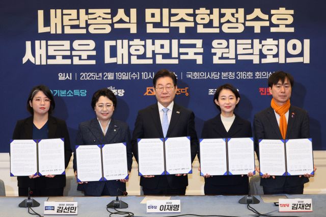 이재명 더불어민주당 대표를 비롯한 야 5당 대표들이 19일 서울 여의도 국회에서 열린 '내란종식 민주헌정수호 새로운 대한민국 원탁회의' 출범식에서 공동선언문에 서명 후 기념 촬영하고 있다. ⓒ 연합뉴스