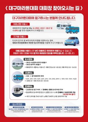 한편, 대구시와 대구경찰청은 대회 준비기간 중 현장답사를 실시하고 교통소통 방안을 논의해 우회도로를 확보하고, 인근 주민 교통통제 사전안내를 실시했으며, 대회 당일에도 코스 구간 교통통제로 인한 시민 불편을 최소화하기 위해 노력할 예정이다.