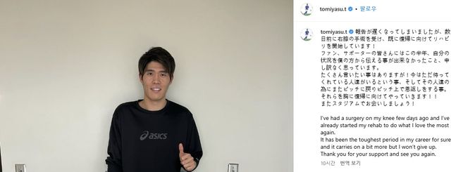 무릎 부상으로 고생하던 도미야스는 지난해 10월에 돌아왔지만 10분 뛰고 다시 쓰러졌다. 이후 1분도 못 뛰고 이번 무릎 수술을 받은 것이다.