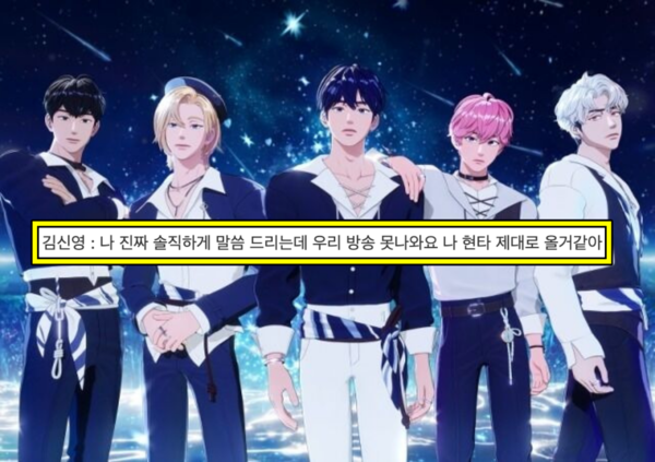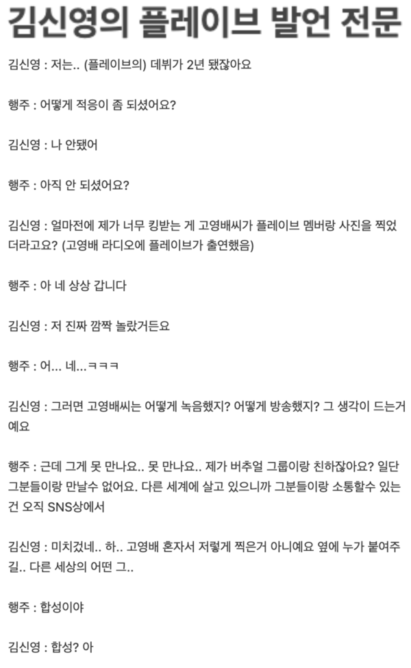 김신영 : 얼마전에 제가 너무 킹받는 게 고영배씨가 플레이브 멤버랑 사진을 찍었더라고요? (고영배 라디오에 플레이브가 출연했음)