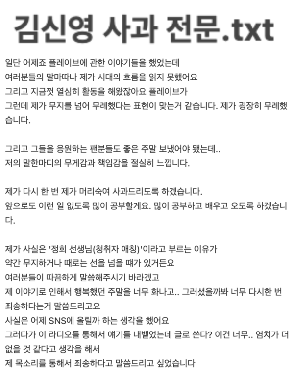 김신영은 “제가 버추얼 그룹 플레이브에 대해 한 말들이 공정하고 객관적이지 못했다는 의견을 겸허히 받아들인다”며 “상처받으신 아티스트와 팬분들께 진심으로 사과드린다”고 밝혔다.