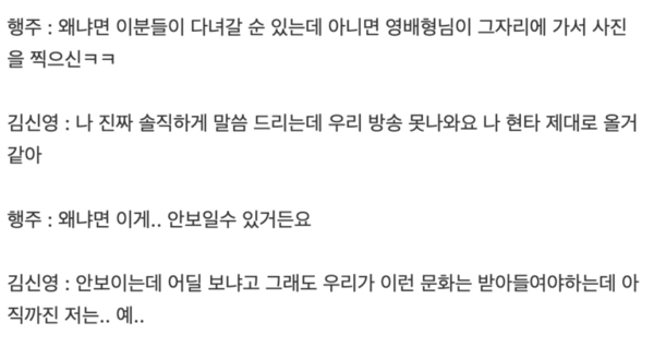 김신영 : 안보이는데 어딜 보냐고 그래도 우리가 이런 문화는 받아들여야하는데 아직까진 저는.. 예..
