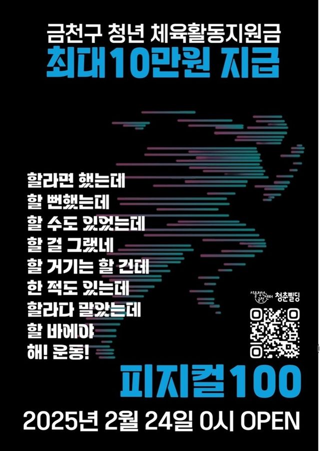 서울 금천구(구청장 유성훈)는 청년들의 운동 습관 형성을 돕는 프로그램인 '피지컬 100' 참여자를 모집한다고 19일 밝혔다.