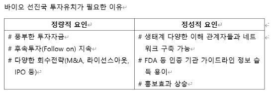 투자시장의 한계, 기업공개의 좁은 문을 벗어나려면 해외투자 유치에 적극적으로 눈을 돌려야 한다. 단순히 풍부한 유동성 때문만은 아니다. 바이오 최대 시장인 미국의 경우 자본시장의 플레이어들과 제약회사 간 긴밀한 네트워크가 구축돼 있어 VC 투자를 유치하게 되면 미국 바이오 시장의 생태계에 진입하게 되는 보이지 않는 효과가 있다. VC가 유동성을 투입해 개발단계를 끌어올리고 제약사가 그 회사를 인수하는 인수합병 시장이 발달돼 있기 때문이다.