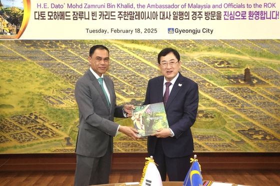 주낙영 경주시장이 다토 모하메드 잠루니 빈 카리드(Dato' Mohd Zamruni Bin Khalid) 주한말레이시아 대사를 18일 시청에서 접견하고, 양국 간 미래지향적 교류 및 협력 방안에 대해 의견을 나눴다.
