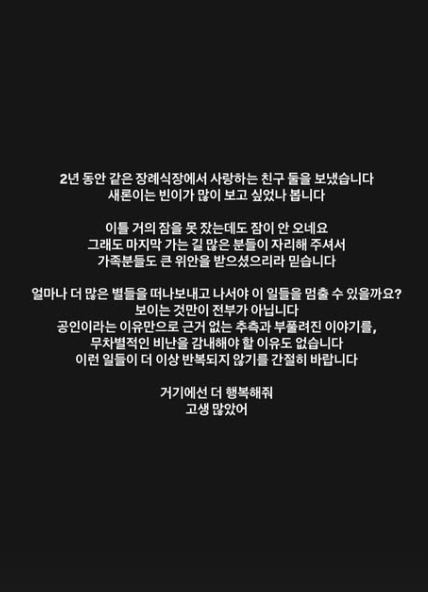 키노는 이어 “마지막 가는 길 많은 분들이 자리해 주셔서 가족분들도 큰 위안을 받으셨으리라 믿는다”며 “얼마나 더 많은 별들을 떠나보내고 나서야 이 일들을 멈출 수 있을까요? 보이는 것만이 전부가 아니다. 공인이라는 이유만으로 근거 없는 추측과 부풀려진 이야기를, 무차별적인 비난을 감내해야 할 이유가 없다”고 가짜뉴스와 악플에 대한 비판적 시각을 드러냈다.