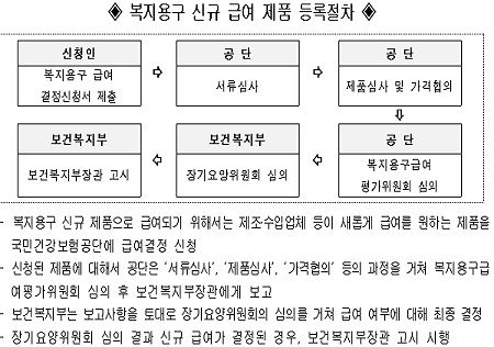 공단은 신청 접수 이후 서류심사를 통과한 신청 건에 대하여 제품 심사, 가격 협의 등을 실시한 후 복지용구 급여평가위원회 및 보건복지부 장기요양위원회의 심의를 거쳐 급여 여부를 결정한다.