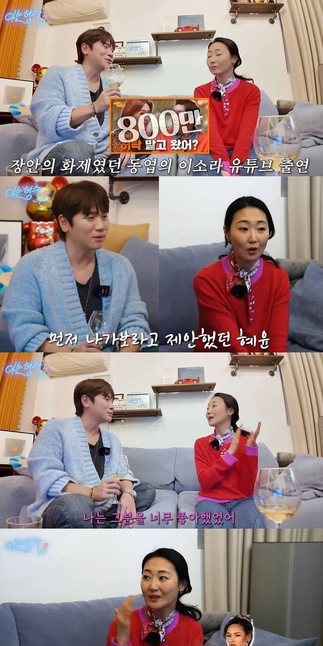 전연인 이소라의 유튜브 채널에 신동엽이 나간 것에 대한 비화도 털어놨다. 그는 "내가 나가라고 했다. 왜냐면 너무 궁금한 거다. 솔직히 말해서 우리 남편을 알기 전부터 나는 그분을 너무 좋아했다. 너무 멋진 여자라고 생각했다"라고 전했다.
