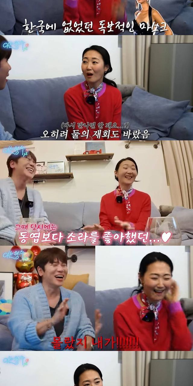 이어 "내가 고등학생 때 슈퍼모델이 됐는데 너무 멋있는 거다. 한국에 없는 마스크 있지 않냐. 신입사원 때 남편 처음 알 때도 다시 만나면 안 되냐고, 두 분 너무 잘 어울리셨는데 너무 아쉽다고 그랬다. 저는 사실은 그 사람을 그렇게 좋아하는 사람은 아니었다. 저는 사실 소라 언니 팬이었지 그분의 팬은 아니었다"라며 솔직한 면모를 드러냈다.