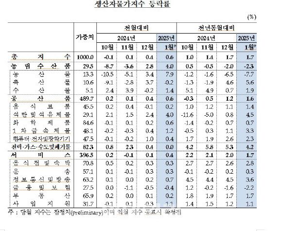 공산품은 전월대비 0.6% 올랐는데, 석탄 및 석유제품이 4.0%, 1차금속제품이 1.2% 각각 상승했다. 전력·가스·수도 및 폐기물은 하수처리(2.8%) 등이 올랐으나 산업용도시가스(-2.5%) 등은 내려 전월 대비 보합을 기록했다. 서비스의 경우 정보통신및방송서비스(0.7%) 및 사업지원서비스(1.1%) 등이 올라 전월 대비 0.4% 상승했다.