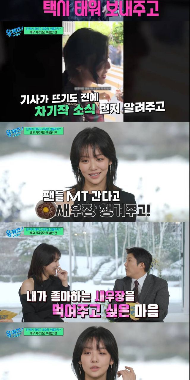 차주영은 "MT를 간다는데 맛있는 것 좀 주고 싶은데"라고 말했고, 이어 "제가 (팬들이) 새우장을 (즐겨) 먹는걸 알았던거다"라고 말했다.
