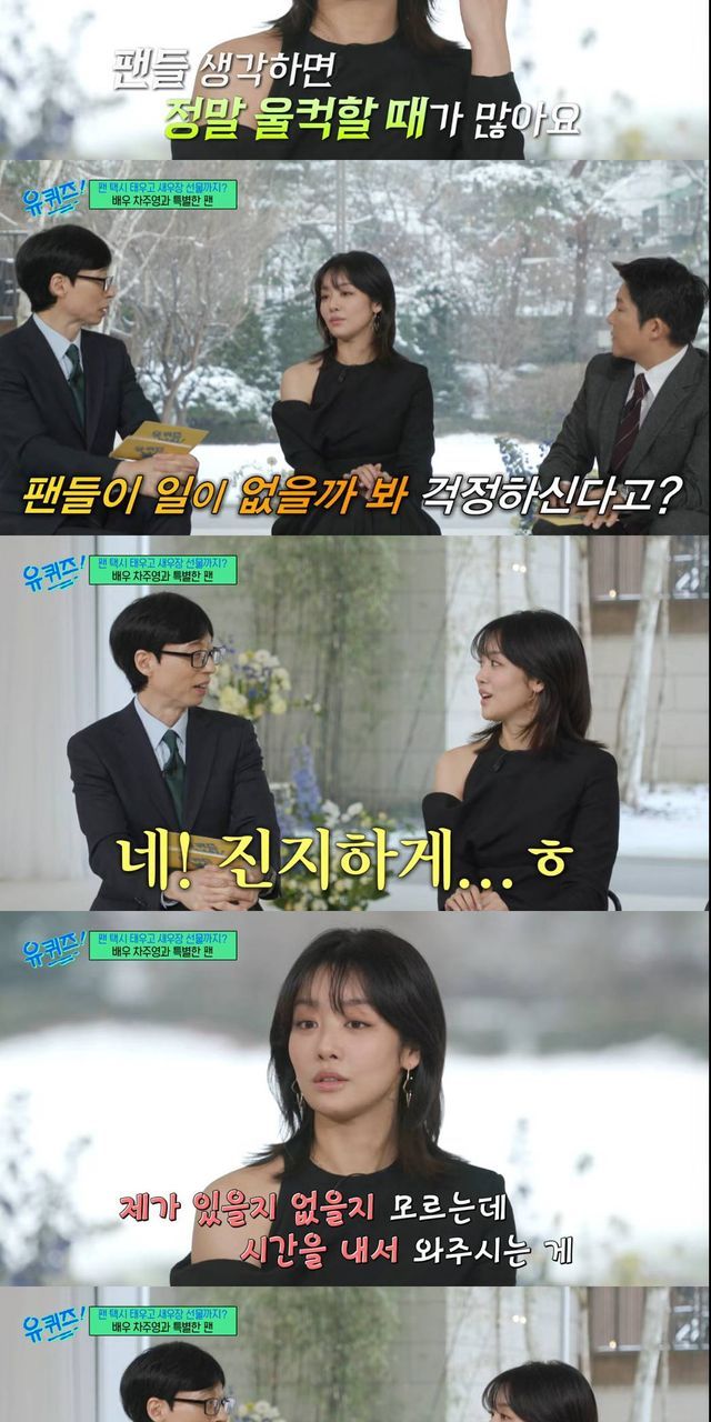 "팬들 생각하면 정말로 울컥울컥할 때가 많다"라고 덧붙여 훈훈함을 자아냈다. 유재석은 차주영에게 "팬들 일이 없을까봐 걱정이라고"라고 말했다.