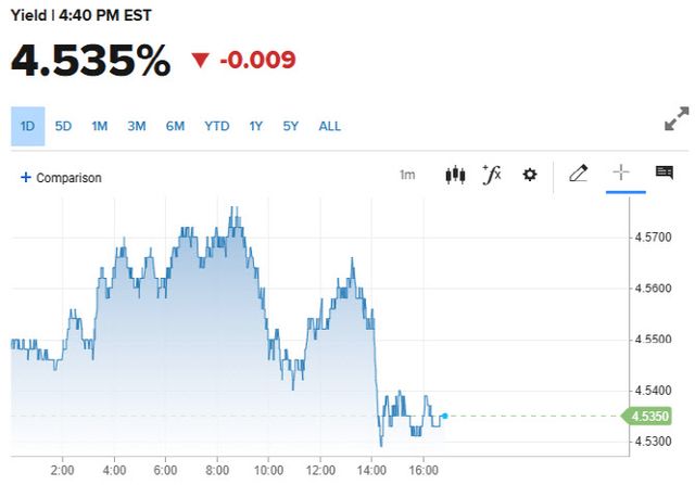 오후 4시40분 기준 10년물 국채금리는 전 거래일 대비 0.9bp(1bp=0.01%포인트) 빠진 4.535%를 기록 중이다. 연준 정책에 민감하게 연동하는 2년물 국채금리는 2.3bp 하락한 4.274%에서 거래되고 있다.