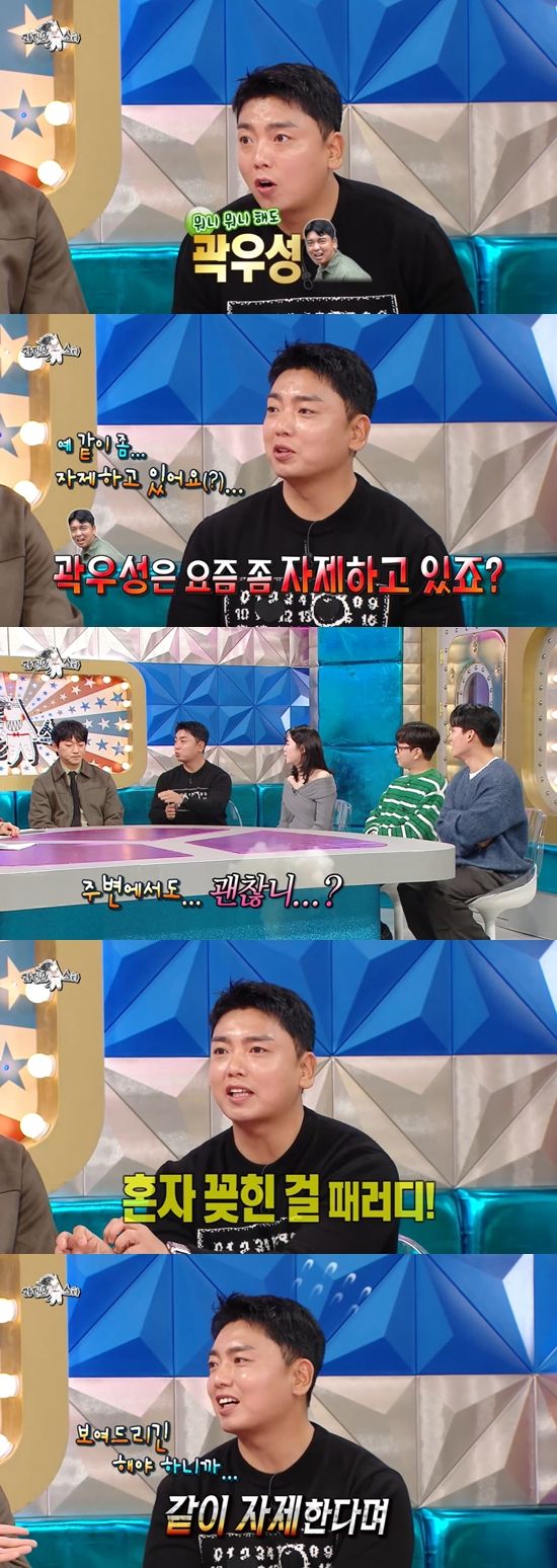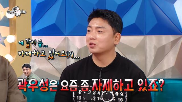 김구라가 "곽우성은 요즘 자제하고 있지?"라고 묻자 곽범은 "같이 좀 자제하고 있다"고 답했다. 유세윤이 "누구랑 같이 자제하냐"고 묻자 곽범은 "본체랑 (자제한다)"고 말했고, 김구라는 "그게 예의다. 운명공동체 아니냐"고 거들었다. 곽범은 "주변에서도 '괜찮냐'고 하는데, 뭐가 괜찮냐는 건지 (모르겠다). 자중하고 있긴 하다"고 이야기했다.