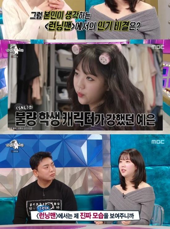 특히 장도연은 "예은 씨가 생각하기에 '런닝맨'에서 예능적으로 잘 풀리는 이유를 찾는다면 뭐가 있겠냐"라며 궁금해했고, 지예은은 "'SNL' 할 때는 일진 캐릭터를 많이 해서 그 캐릭터가 강했다. '런닝맨'에서는 진짜 모습을 보여주니까 사람들이 좋아하시는 거 같다. 진짜 모습을 귀여워하시는 거 같다"라며 전했다.