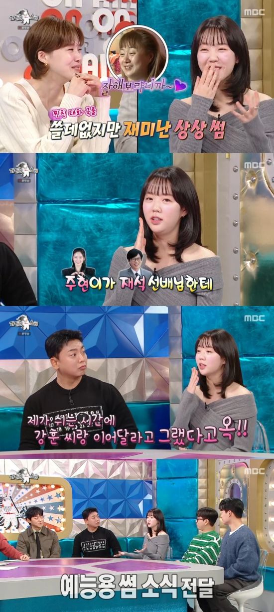 또 장도연은 "고정 자리와 함께 예능 라인도 얻으셨다더라"라며 궁금해했고, 지예은은 "제가 유재석 선배님을 되게 좋아했다"라며 고백했다.