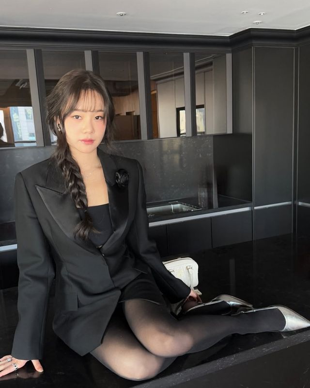 블랙 이너에 루즈핏한 블랙 재킷을 입은 김민설은 반투명 스타킹까지 올블랙 하의실종룩을 선보였다. 특히 김민설은 테이블 위에서 다리를 구부리며 과감한 포즈를 선보여 남다른 각선미 라인을 자랑하며 아름다움에 감탄을 더했다.