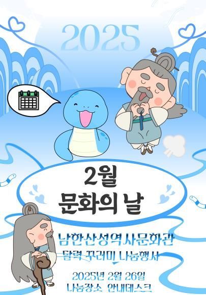 남한산성역사문화관에서는 방문하는 관람객에게 2025년 달력 만들기 꾸러미를 나눔한다. 남한산성역사문화관은 2024년 10월 개관하여 첫 겨울을 나고 있다. 막바지 겨울, 남한산성의 설경을 만끽하고 따뜻한 역사문화관에서 전시 관람과 체험 프로그램을 즐겨보길 바란다.
