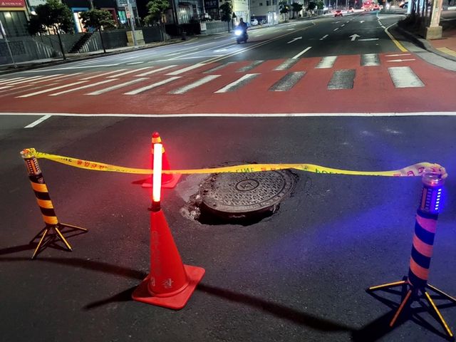 20일 제주도소방안전본부에 따르면 전날 오후 7시51분쯤 제주시 건입동 제주항 1부두 입구 대도로변에서 맨홀 뚜껑이 내려앉으며, 그 주변으로 지름 20㎝의 싱크홀이 발생했다는 신고가 접수됐다.