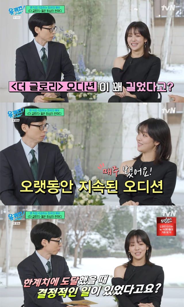 이날 차주영은 넷플릭스 오리지널 시리즈 ‘더 글로리’의 오디션에 합격한 사연을 전했다. 그는 “오디션이 거의 두 달 가까이 진행됐다. 두 달간 거의 매주 뵈었다. 매번 같은 대본으로 오디션을 봤다. 오디션을 보면서 ‘왜 나를 빨리 안 떨어뜨리시지?’ 이런 생각을 했다”고 말했다.