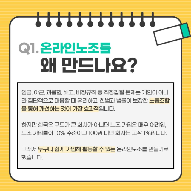 기업 노조(지회·분회)를 만들기 어려운 중소기업 직장인들이 온라인으로 쉽게 가입해 익명으로 활동할 수 있는 노조, 회사가 아닌 업종과 직종을 기반으로 활동하는 노조, 업종별·직종별 사용자단체와 정부 등을 상대로 교섭해 전체 직장인의 처우개선과 제도개선을 추진하는 노조를 고민했다.