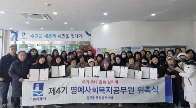 [와이뉴스] 수원시 영통구 원천동은 지난 19일 지역 내 위기가구 발굴을 위한 인적 안전망 확충을 위해 '제4기 원천동 명예사회복지공무원 위촉식'을 진행했다.