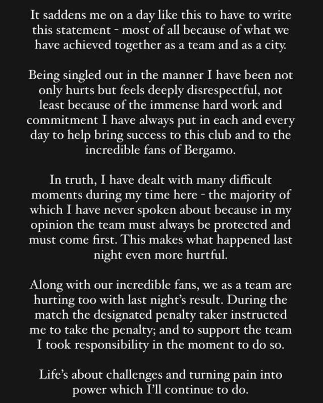 루크먼은 자신이 아탈란타에서 어려운 순간을 많이 겪었다며 "그동안 말하지 않은 일들이 많다. 하지만 나는 항상 팀이 최우선이라고 생각했고, 팀이 흔들리지 않도록 조용히 견뎌왔다. 그렇기 때문에 이번 일이 더욱 아프게 느껴진다"라며 의미심장한 발언을 덧붙였다.