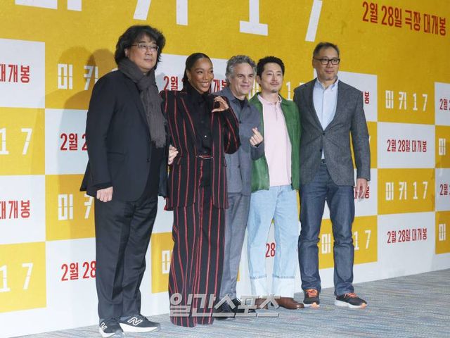 봉준호 감독이 한 달 만에 다시 국내 취재진 앞에 섰다. 이번에는 로버튼 패틴슨 대신 나오미 애키, 스티븐 연, 마크 러팔로와 함께했다.