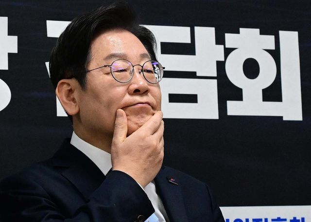 이재명 더불어민주당 대표가 19일 서울 마포구 한국방위산업진흥회에서 열린 '트럼프 시대 : 한미동맹과 조선산업·K-방산의 비전' 현장 간담회에서 생각에 잠겨 있다. / 뉴스1