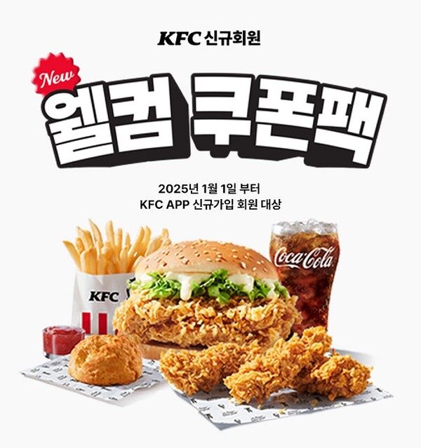 글로벌 치킨·버거 브랜드 KFC가 2025년 1월 1일부터 자사앱 신규 가입 회원을 대상으로 풍성한 혜택이 담긴 ‘웰컴 쿠폰팩’을 제공한다.