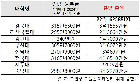 20일 국회 교육위원회 소속 고민정 의원실이 전국 국립대 의대 10곳으로부터 제출받은 자료에 따르면, 지난 5일 기준 8개 대학 소속 2024학년도 1학년 의예과 학생들의 등록금 반환·이월(군 휴학 등 제외)은 없었던 것으로 확인됐다. 이들 8곳 의대의 의예과 학생 수를 감안해 ‘증발’한 등록금 총액을 산출하면 약 22억6200만원에 달한다.
