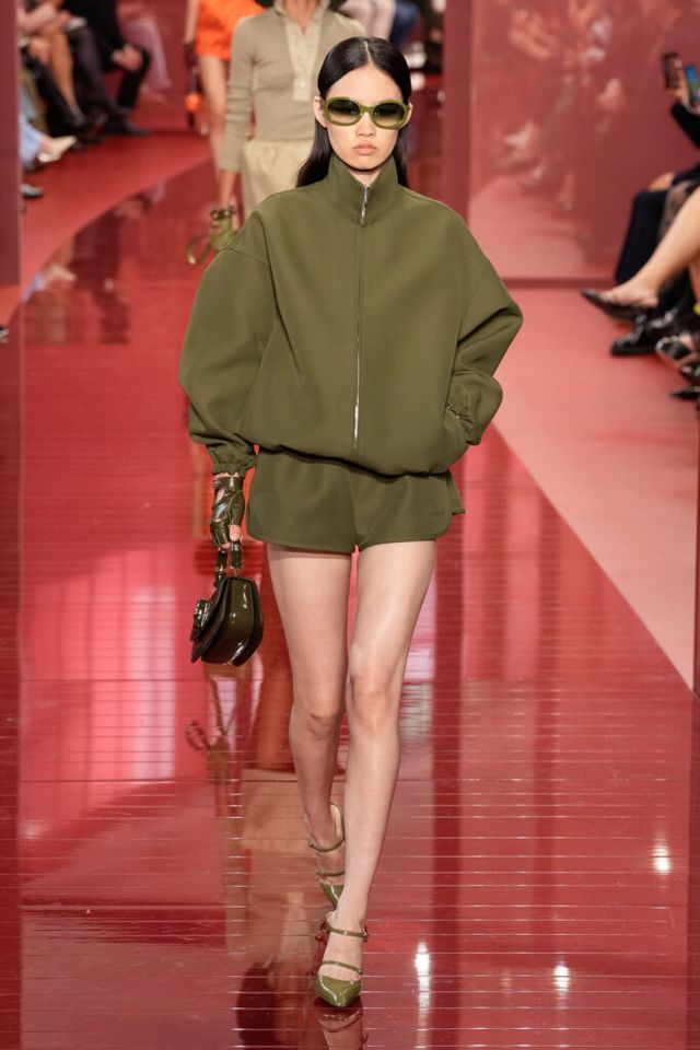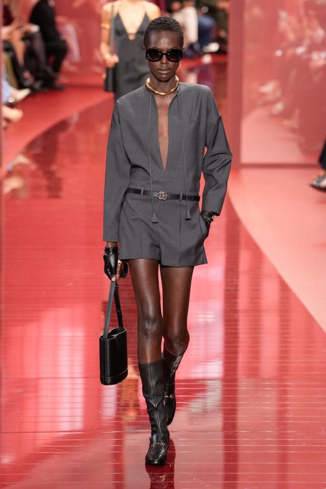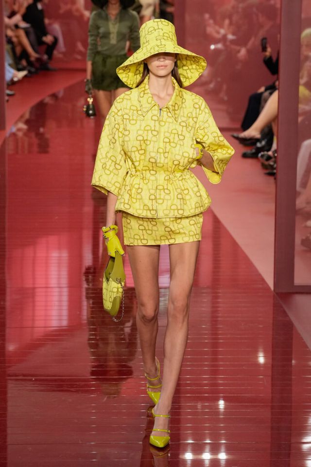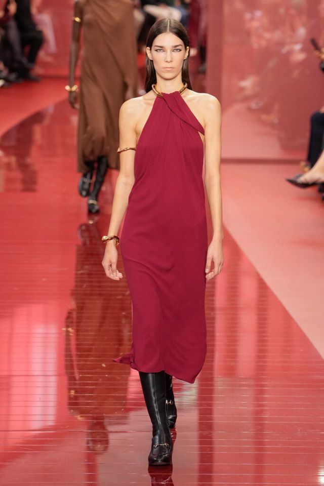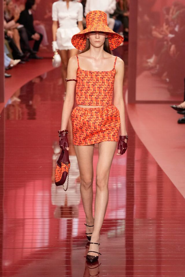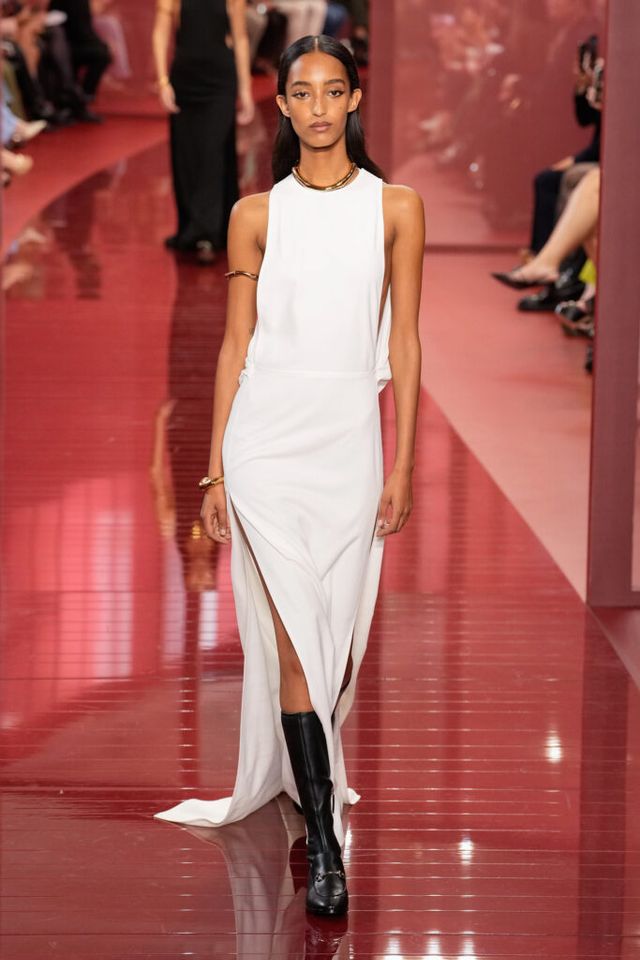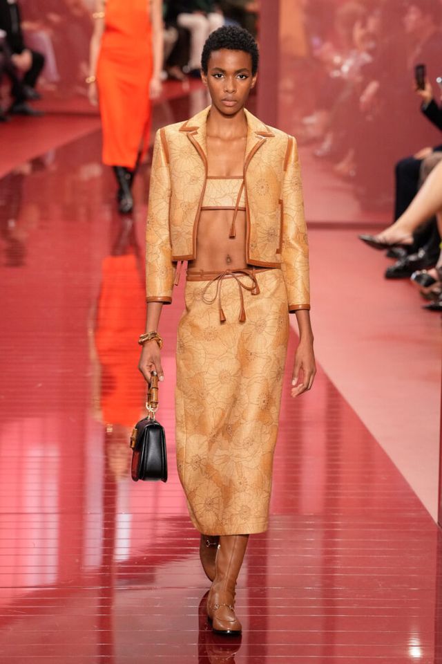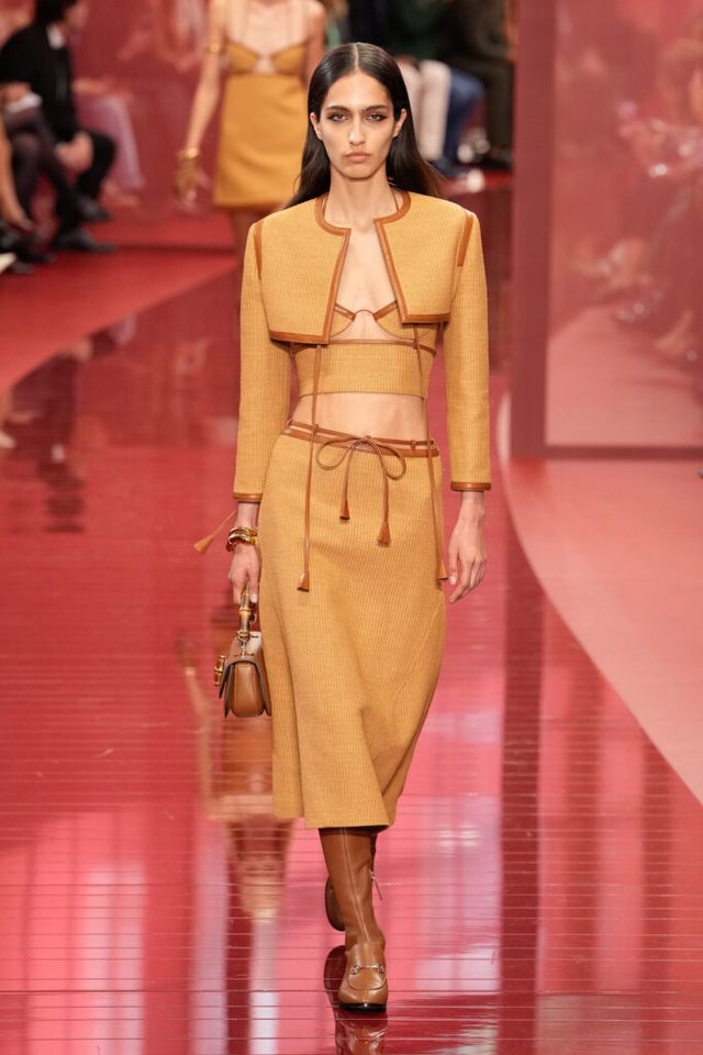 NOTE ‘태양이 바닷속으로 잠기는 찰나는 온전한 우리 자신을 발견할 수 있는 순간’이라는 이야기를 담고 싶었던 사바토 데 사르노. 화이트, 옐로, 오렌지, 짙은 버건디의 구찌 로소 앙코라로 점차 깊어지며 여름날의 석양빛에서 영감을 받은 컬러가 중심을 이뤘다. ‘캐주얼한 우아함’이 깃든 1960년대 식 실루엣은 당장 입고 해변으로 뛰어가고 싶을 만큼 센슈얼하고 감각적이다. 피날레에서는 마치 해변에서 리듬을 타는 듯한 모델들의 흥겨움으로 고조되며 아름다운 구찌의 여름을 완성했다.